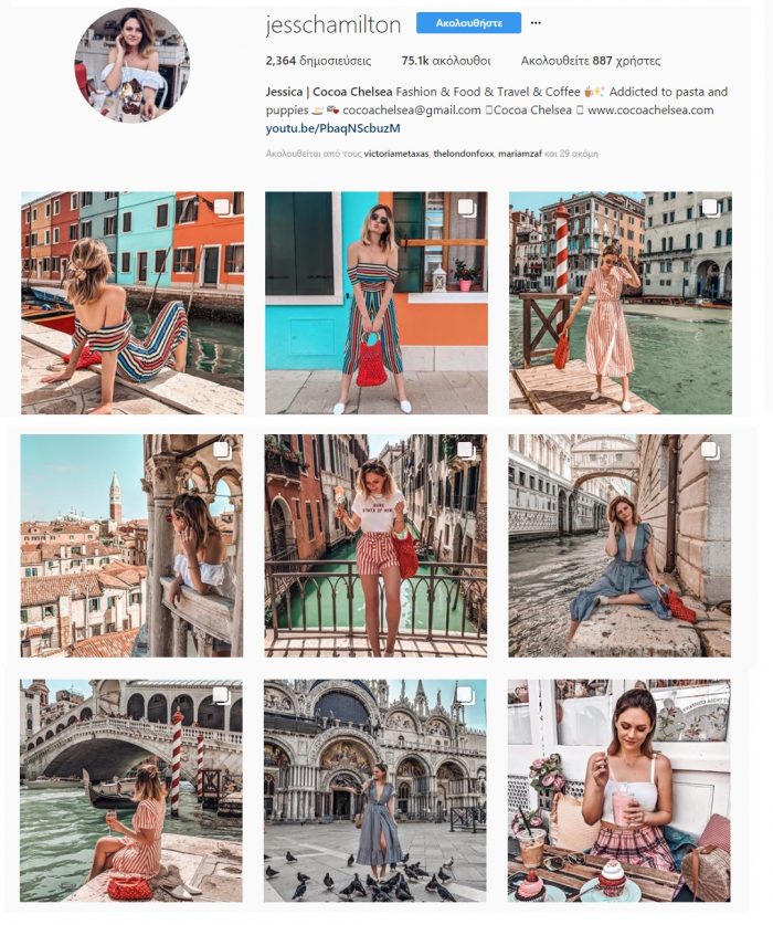 Η Jessica έχει έναν πανέμορφο lifestyle λογαριασμό στο Instagram. Δημοσιεύει κυρίως φωτογραφίες από το προσωπικό της στυλ και μέρη που επισκέπτεται. Αγαπά την ζεστή σοκολάτα οπότε θα δείτε και μερικές λαχταριστές φωτογραφίες φαγητών. Το feed της είναι φωτεινό και γεμάτο χρώμα. Το προσωπικό της στυλ είναι κλασσικό αλλά με παιχνιδιάρικα και θηλυκά στοιχεία. Επιπλέον, γεννήθηκε και μεγάλωσε στο Λονδίνο. Οπότε μου δίνει πάντα μερικές καλές ιδέες για το τι πρέπει να κάνω στο ρεπό μου ή που θα μπορούσα να απολαύσω ένα υπέροχο γεύμα. Στην ουσία συνδυάζει όλα όσα ένας υπέροχος lifestyle λογαριασμός δείχνει γι’αυτό και την αγαπώ. Αν σας αρέσουν τέτοιου είδους λογαριασμοί, βρείτε την @jesschamilton!