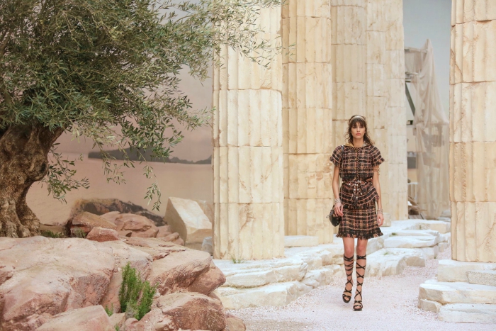 The new 2018 Chanel Cruise collection, which took place in Grand Palais in Paris, travelled us to Ancient Greece, with this stunning fashion show. Karl Lagerfeld whose first book was Greek Odyssey from Homer, was inspired by the nymphs, goddesses and women of Ancient Greece, and brought them to life through fashion. With the outcome being the least breathtaking, we can only admire the masterpieces of this collection. The whole runway was a celebration of fluidity with silk, linen, lace and crepe, sandals and statement pieces of jewelry which combined perfectly the personality of Ancient Greece and the classical style of Chanel with the gold being the main focus of this collection. The vases and the entire decoration, the columns and the ancestral frescoes brought the whole show together and truly represented an Ancient Greek temple, with the olive tree and the warm notes of the sunset as the perfect final touches.