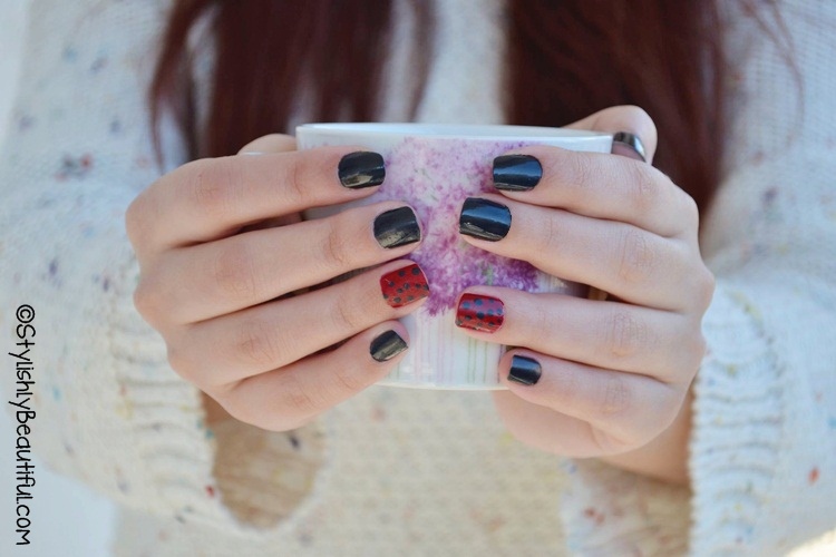 Kleoniki chose a dark-grey version, while painting the ring fingers red, and added some same-hue grey polka-dots. The dark grey makes it serious, yet the polka dots and red add a playful note to the manicure.