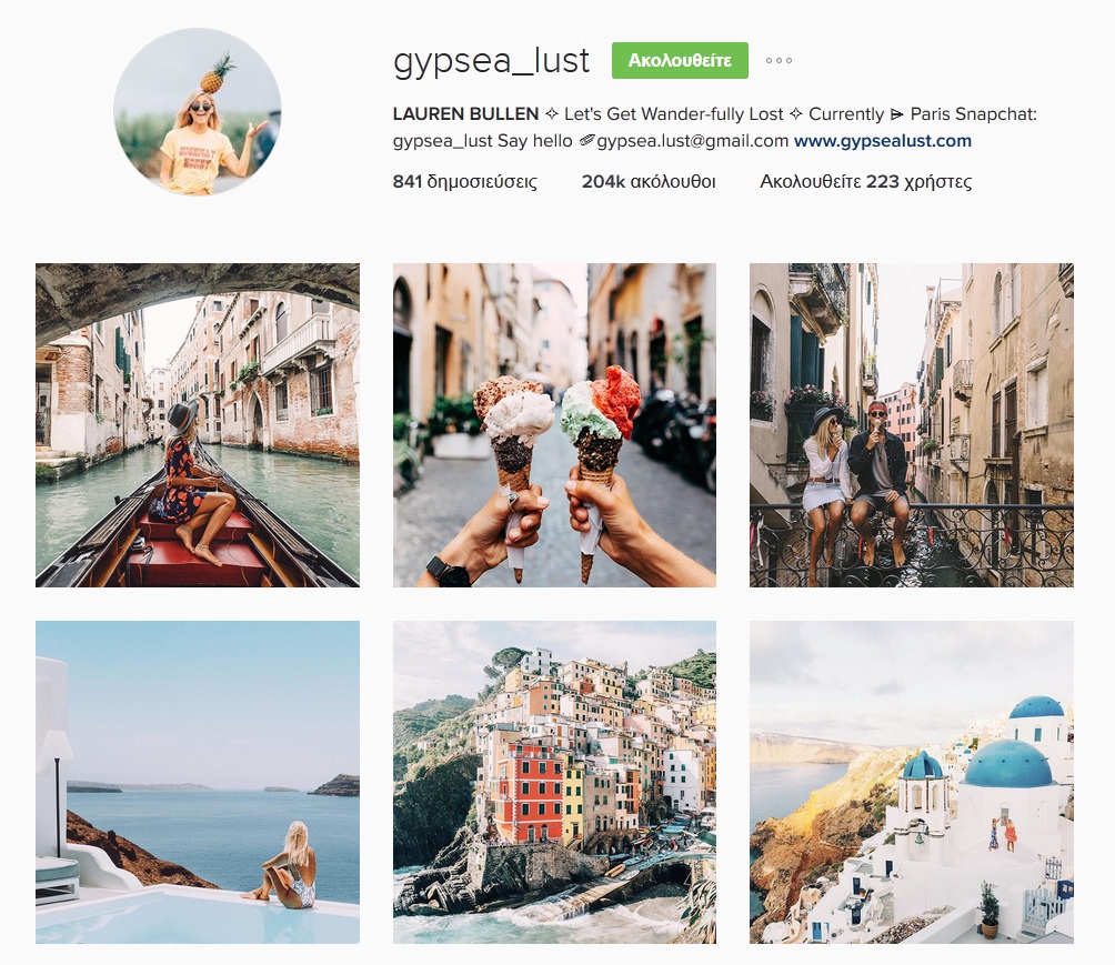 Gypsea_lust is one of the newest accounts I’ve discovered, when one of her photos appeared on my “explore” tab on Instagram. She was actually posting photos from my country, Greece, back then and one look at her grid, convinced me to follow her, and I don’t do that often with people I don’t usually follow elsewhere. The account belongs to Lauren Bullen, an Australian blogger who loves travel, and blogs about that among other subjects, such as fashion & lifestyle. I love how bright her photos are, and I’m a little bit jealous of her lifestyle. You should totally check out her account @Gypsea_lust.